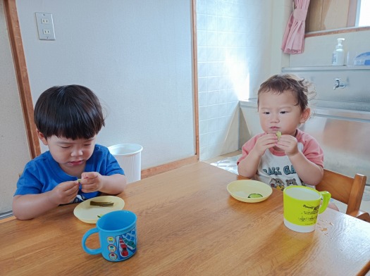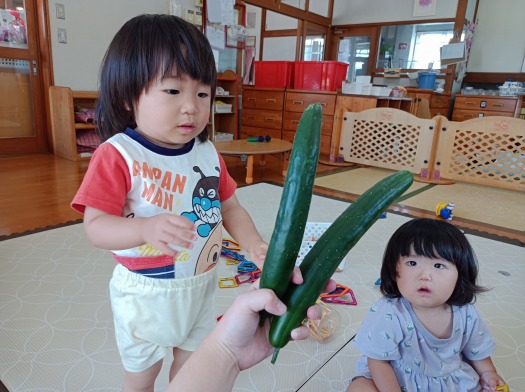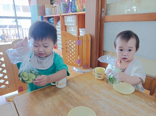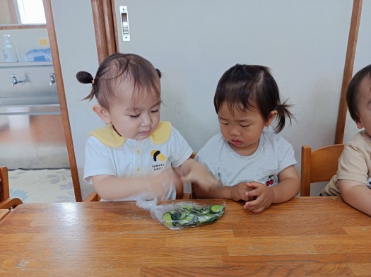 2025年07月07日 きゅうり初収獲 1歳児 ゆき はな・ゆきぐみのきゅうりが収獲できました! とっても大きくて綺麗なきゅうりです♪ 大きなきゅうりにびっくりな表情を浮かべるこどもたち。 触ると、ちくちくとげがあって、感触も不思議! このきゅうりは給食室に預かってもらい、翌日塩もみでいただきました。 職員が切ったきゅうりと塩を袋に入れ、こどもたちがもみもみ。 しっかり揉み込んだら食べ頃です。 自分で作った塩もみきゅうりはとっても美味しくて、お野菜が苦手な子もおかわりをしてたくさん食べていました。 手作りのパワーですね! 一覧へ戻る