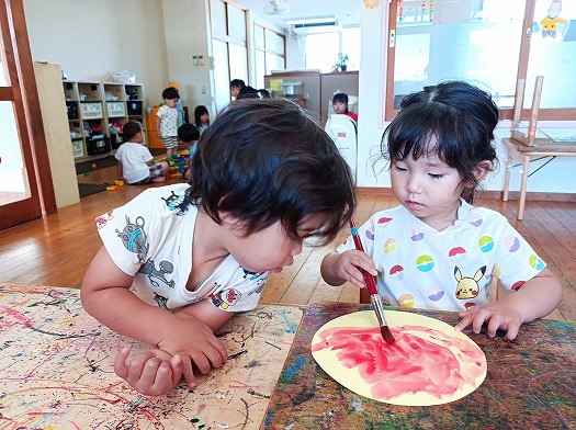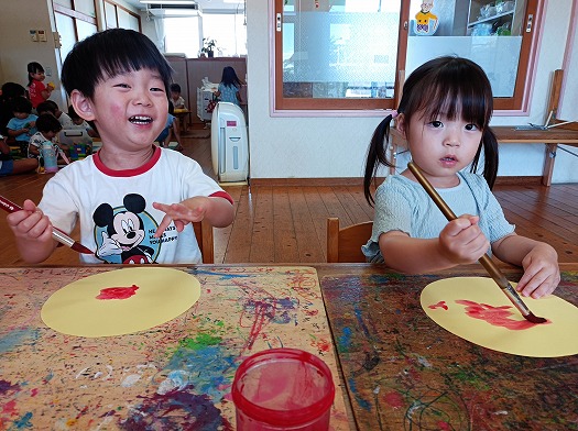 赤色の絵の具を使い丸い画用紙に塗りました。
