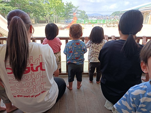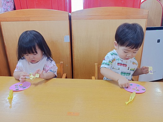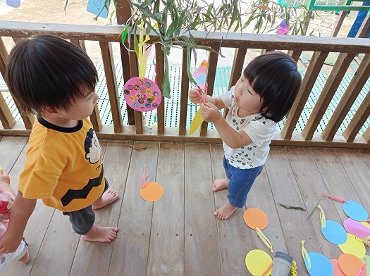 2025年07月12日 笹の葉さらさら 1歳児 ゆき 7月と言えば七夕ですね。 ゆきぐみでも、七夕飾りを作って、準備をしました。 シールをたくさん貼った素敵な丸飾りを作って、保育者と一緒に笹に飾り付けます。 保育者が飾りをつけるのを真似しながら笹の先に引っ掛ける姿は、「手先が器用になったなぁ」と成長を感じられる瞬間でした。 みんなのお願い事も飾り付けた笹は、7月7日に園庭で囃し、空に願い事が届くように思いを込めて見守りました。 笹が燃える「パチパチ」と鳴る音を聞きながら、癒されるこどもたちでした。 一覧へ戻る