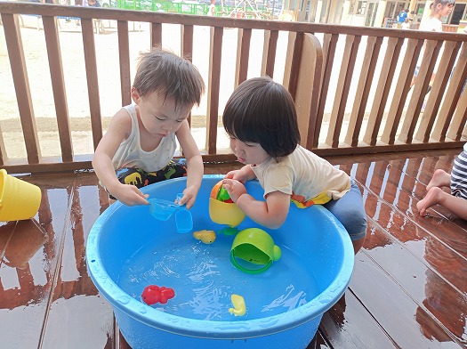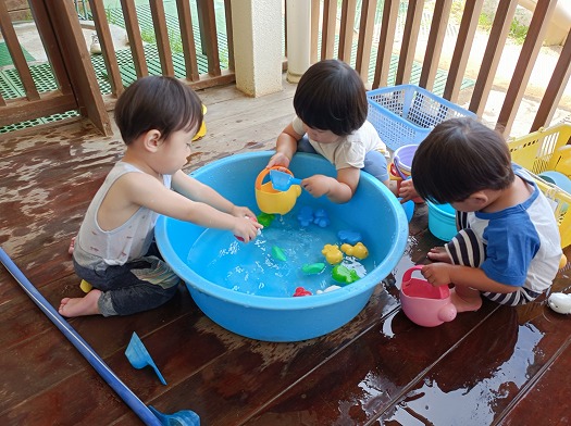 テラスに水を溜めたタライとジョーロやバケツ、きんぎょのおもちゃなどを用意すると、こどもたちは大喜び!