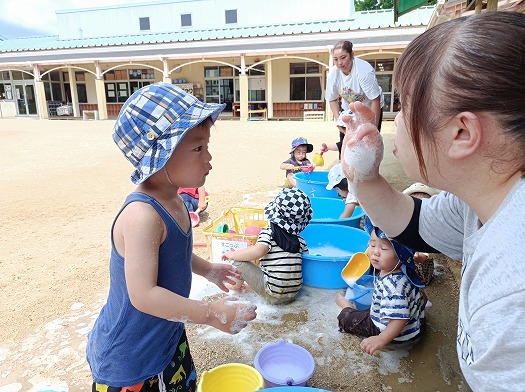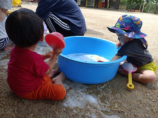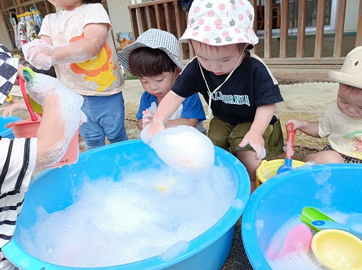 水に石鹸を入れて保育者が掻き混ぜると、タライの中は泡でいっぱいに。