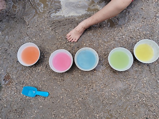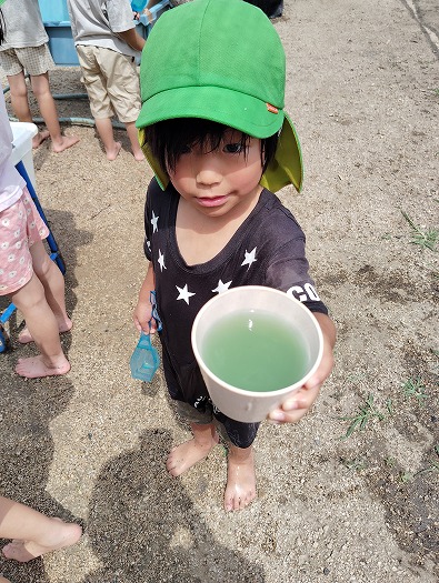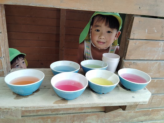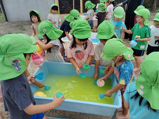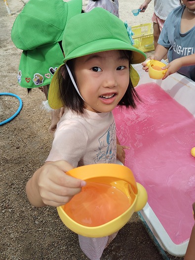 2025年07月15日 どんどん混ぜよう! 4歳児 ほし 赤、青、黄の3色の色水を用意して色水あそびを楽しみました。 違う色水を混ぜていくとどんどん色が変わって、違う色が誕生します。 その様子に「色が変わった!」「メロンジュースができた!」と嬉しそうにしていました。 オレンジになったよ みてー! ジュース屋さんが開店していました。 最初は3色だけでしたが、どんどん色が増えて大盛り上がりでした。 一覧へ戻る