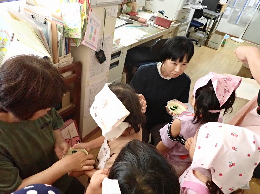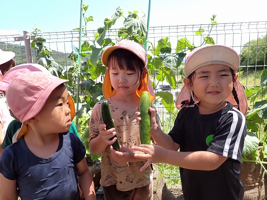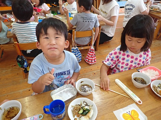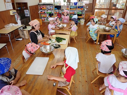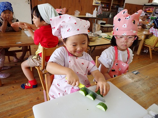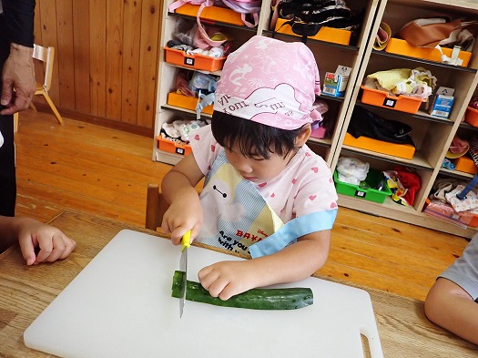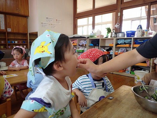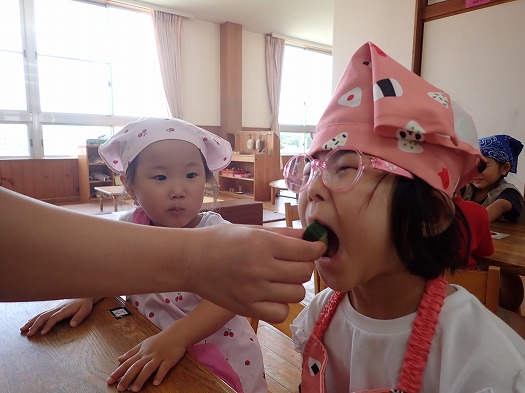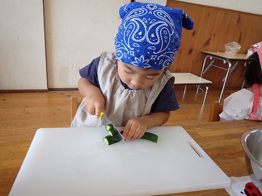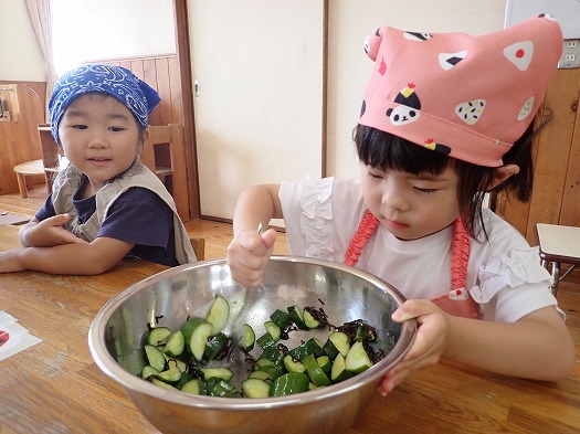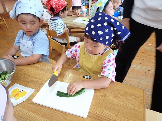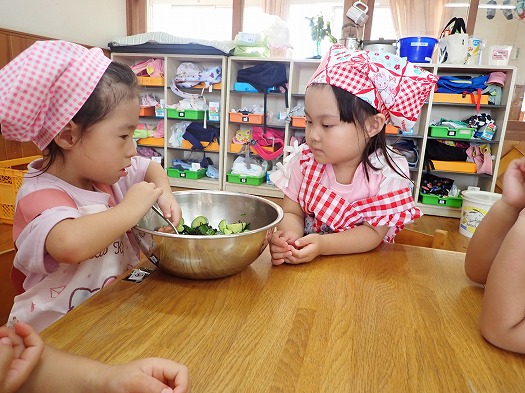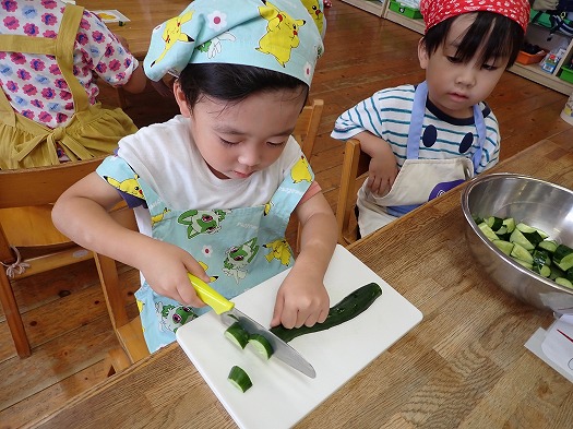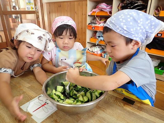 2025年07月17日 つき組クッキング 3歳児 つき つき組で育てていたきゅうりが収穫できたのでクッキングをしました。 料理名「きゅうりの塩昆布和え」 包丁ドキドキ♡ でもとっても上手でした。 切った後は、塩こんぶとごま油で和えました。 みんなでまぜまぜ。 たまにつまみ食い。。 完成し、園長先生たちにもおすそ分けしました。 いろんな方に食べてもらい「おいしい」と言ってもらえて嬉しかったね♪ 楽しかったね。またしようね。 一覧へ戻る