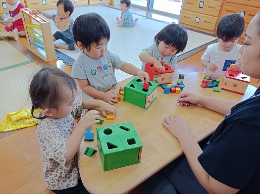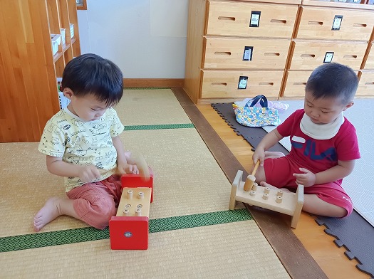 2025年07月30日 全集中! 1歳児 ゆき ゆき組の昼食は2グループに分かれて食べています。 後半組のグループは、指先を使ってじっくり遊ぶ機会を作っています。 型はめボックスやとんかちで杭を叩くおもちゃなど。大人数ではじっくり楽しむことができないおもちゃたちです。 集中して遊ぶので、ご飯までの時間があっという間に過ぎていきます。 時には散歩に出掛けて過ごすこともあります。 今日は何をして過ごそうかなと考えてわくわくする保育者です。 一覧へ戻る