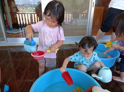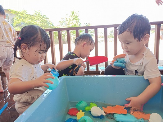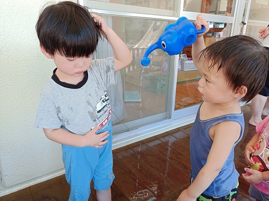 おもちゃを渡し合ったり、ジョーロで水を掛け合ったり、楽しそうなこどもたちでした。