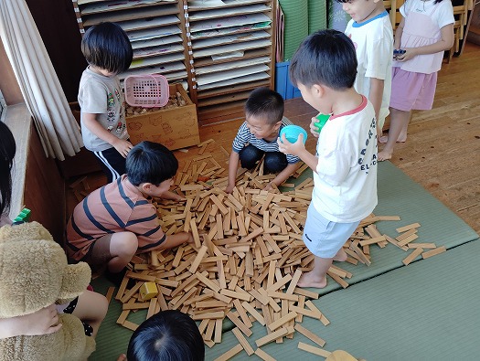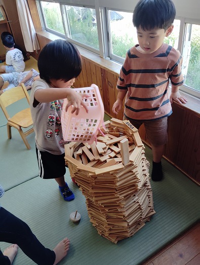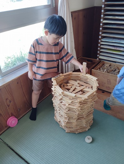 2025年08月01日 夕方のほし組で 4歳児 ほし そーっとね いっぱいいれちゃえ! 崩れたー!! こんなに大きなタワーを作ることができました! 崩れたのをみると「こんなに多くのカプラを使ってたんだな…!」と驚きました。 外が暑くなり夕方になかなか園庭に出れない日が続きますが、室内でも楽しく遊んでいます! 一覧へ戻る