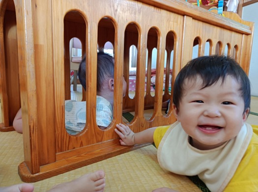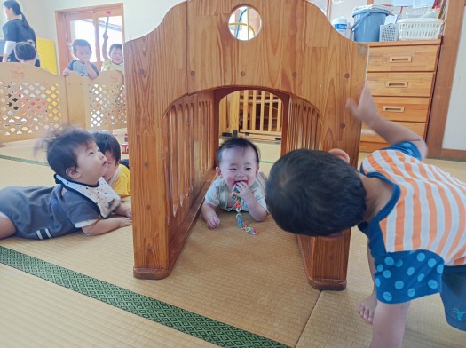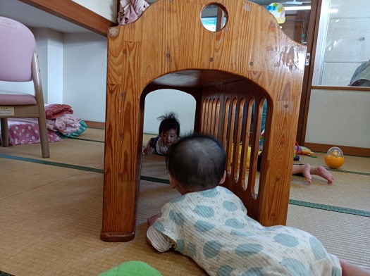 2025年08月12日 トンネルあそび 0歳児 はな はな組の片隅にそっと置いてあったトンネル。 こども達がずりばいで移動ができるようになってきたのでついに出番です! おーい! こっちだよ~! トンネルの向こう側に友だちがいるのを発見! 覗きこんで目が合うとお互いにっこり笑顔です。 見てみて!入ってる! 友だちが中に入っているのを見て嬉しそうにする姿も見られました。 楽しかったね!また、みんなであそぼうね! 一覧へ戻る