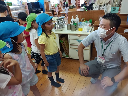 幼稚園・保育園と小学校との連携を進める架け橋プロジェクトの一環で、今年の夏も小学校の教員方が来ていただきました
