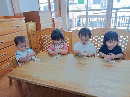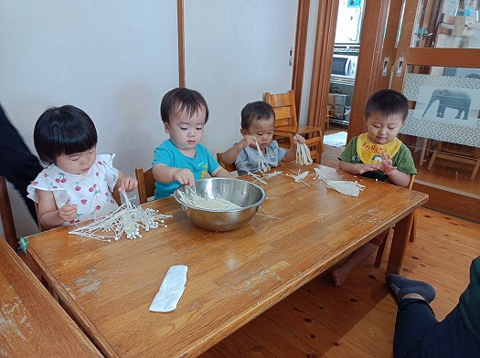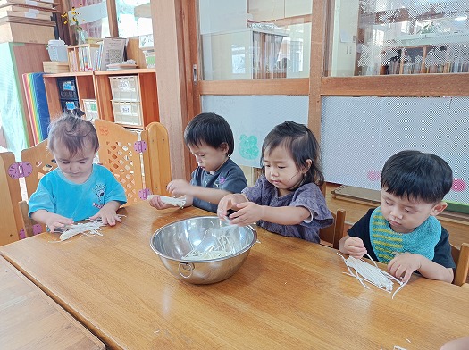 2025年08月27日 えのきマスターへの道のり 続編 0歳児 はな 1歳児 ゆき 久しぶりに給食室の手伝い、えのき割きをしました。 3度目ともなると、手慣れている子も多く、割いてはボールに、割いてはボールにとパパっと一束を終わらせてしまう子も。 中には感触が苦手でなかなか触れない子もいますが、保育者と一緒にやってみるとだんだんと慣れて、最後は1人で割いていました。 その日の給食にえのきを見つけ、「みんなで小さくしたえのきだね」と伝えると、嬉しそうに食べるこどもたち。 その日の給食はより一層よく進んでいました♪ 一覧へ戻る