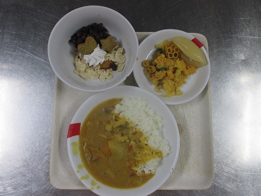 2025年08月27日 今日の給食 給食室 今日は8月の誕生会でした。 8月27日(水) 《献立》 ・バターチキンカレー・・・スパイシーさもあったので「辛い」と言いながらもよく食べていました。 ・花マカロニサラダ・・・野菜嫌いもマカロニが入っていることで、普段より食べていました。 ・白桃・・・甘くておいしい白桃でした。 (おやつ) ・和風パフェ・・・きなこもち、玄米フレーク、あんこ、豆乳ホイップ、抹茶クッキーのパフェです。クッキーはハートと星型に型抜きしました。みんな喜んで食べていました。 誕生日の皆さん、おめでとうございます! 一覧へ戻る