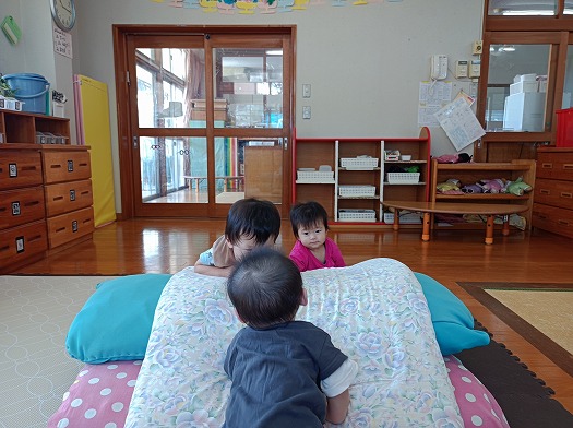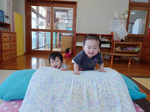 2025年09月05日 登って降りて☆ 0歳児 はな ずりばいが上手になってきたこどもたち。 クッションを重ねてマットを敷いて山を作りました。 すぐにやって来て嬉しそうに登っていました。 登りきって目が合うとこの表情!可愛いですね。 降りるの上手です。 反対側から友だちが来たね! 楽しみながらしっかり、腕と足の力がつくようなあそびを取り入れてたいです。 一覧へ戻る