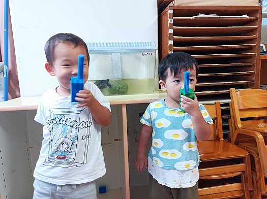その姿を見ていた他の子も一緒のように作って、「○○くん、聞こえますか~」と楽しんでいました。