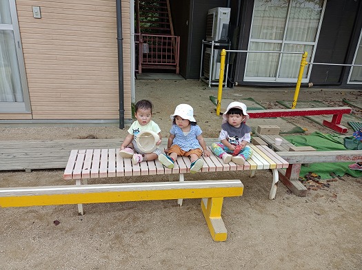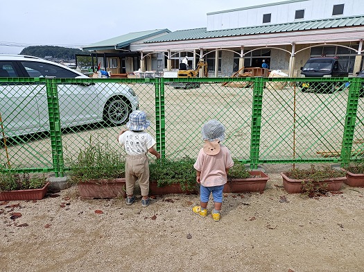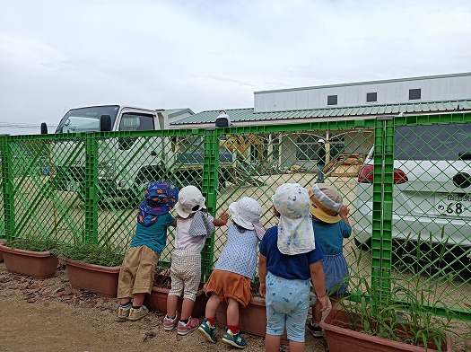 園庭に行こうとテラスに出ると、駐車場にあるショベルカーを見つけました。