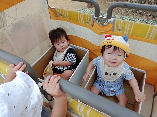 お座りが上手になったので、段ボール車に座って、散歩車で散歩ができるようになりました。