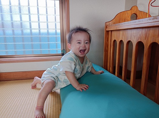 十分に身体の移動ができるように広い空間でハイハイがをしたり自分で手を伸ばして触れてたくさんのことを感じ取ってもらえたりしたらいいなと思います。