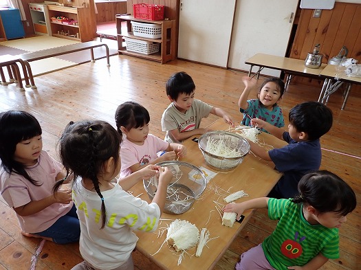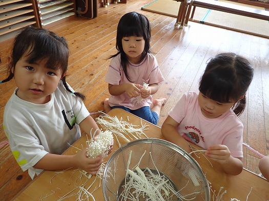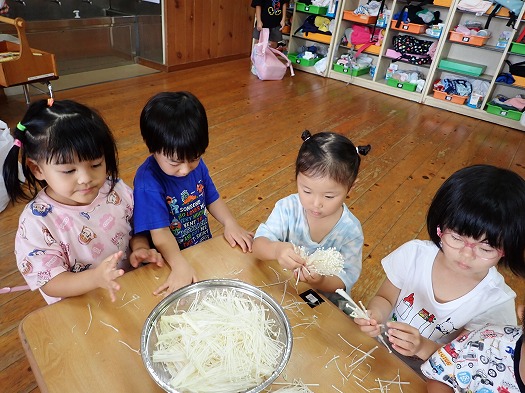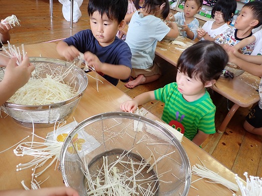 2025年10月01日 enoki 3歳児 つき 給食室の手伝いでえのき割きをしました。 夢中で割いていましたこどもたち。お手伝いありがとう。 その日の給食のメニューのえのき納豆でおいしくいただきました♪ 一覧へ戻る