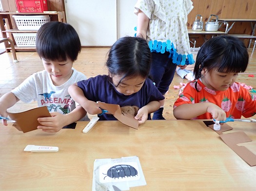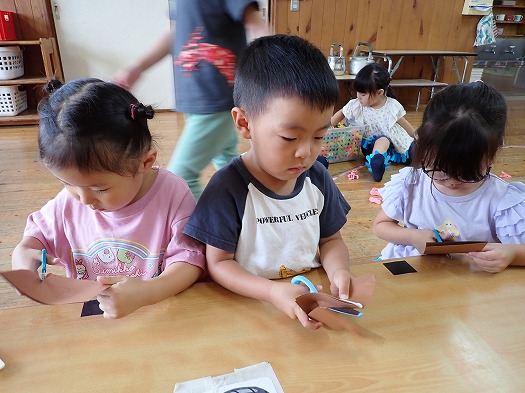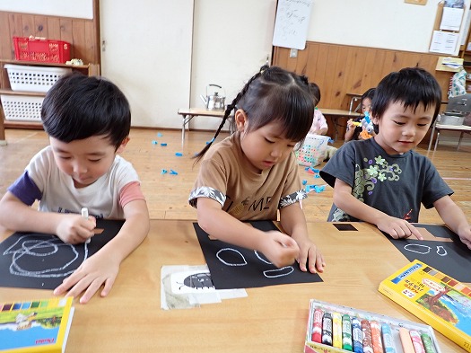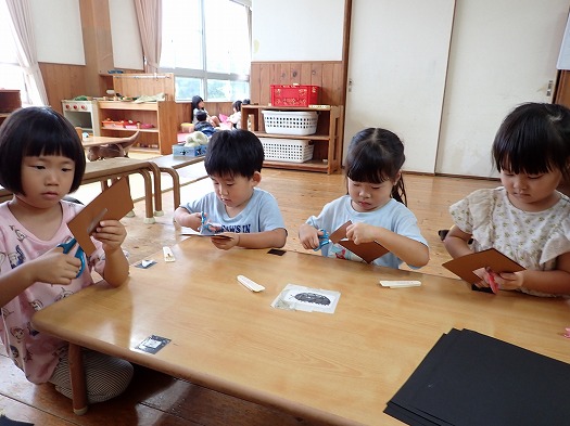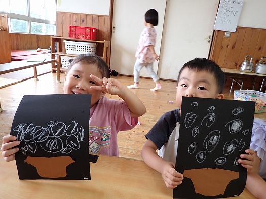 2025年10月01日 お月見製作 3歳児 つき 10月6日(月)は中秋の名月ということでお月見の製作をしました。 三方(団子を乗せる台)も自分たちで線に沿って切りました。 団子も自分たちで描きました。 「大きい団子が食べたい」と大きいな団子を描いていました。 お月見が楽しみだね♪ 壁面に飾っているので、また見てみてくださいね。 一覧へ戻る