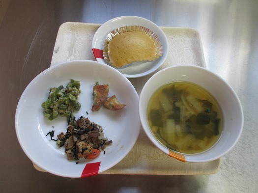 2025年10月01日 給食室(9月29日の給食、おやつ) 給食室 昼食 ・ごはん ・厚揚げと豚肉のひじき煮 ・ちくわの磯辺焼き ・いんげんのごまネーズ和え ・大根のみそ汁 おやつ ・マーラカオ ・牛乳 今日のメニューは、和食でしたが、 良く食べていたようでした。 いんげんは、こどもたちにとっては食べにくい食材のひとつですが、 ごまネーズで和えると食べやすくなるようです。 すりごま、醬油、マヨネーズで和えるだけで簡単です。 お家でも試してみてください! おたのしみおやつは、 ホットケーキミックスで作る『マーラカオ』でした。 一覧へ戻る