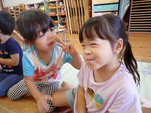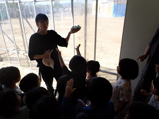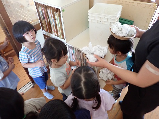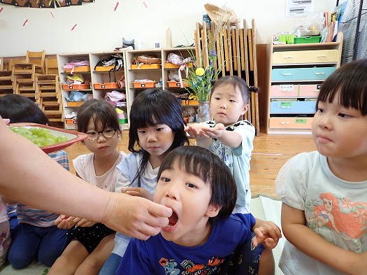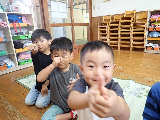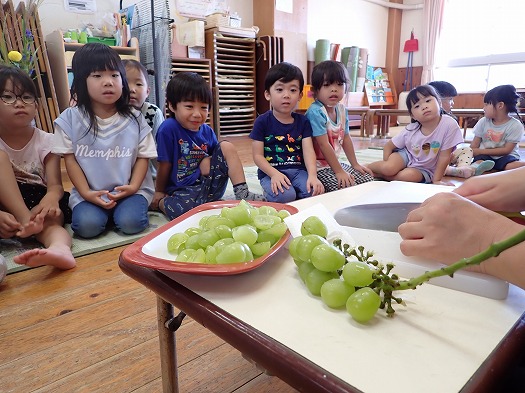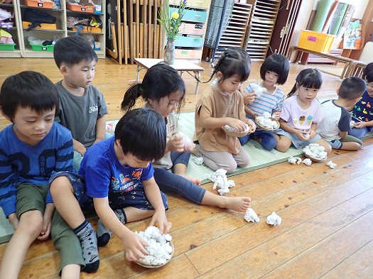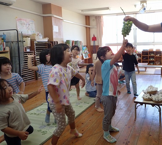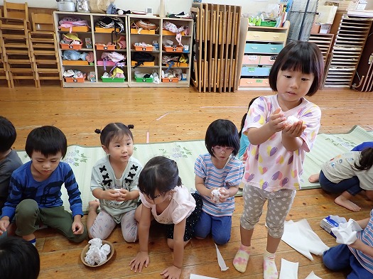 2025年10月06日 お月見会 3歳児 つき つき組お月見会をしました。 お月見といえばお団子ですね。半紙で団子を作りました。 すると、月のうさぎに盗まれてしましました…。 みんなで探すことに。 あったあった。 すると、月うさぎがお詫びにシャインマスカットをくれました☆ 秋の実りにみんな大喜び。 カットしました。 「おいしいー!」 楽しいお月見会でした♪ 夜、お月様を見てね。(うさちゃんが見ているよ) 一覧へ戻る