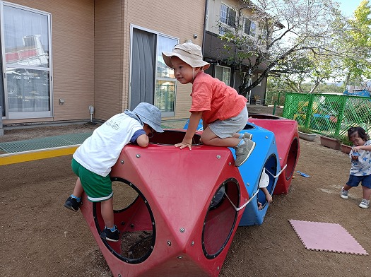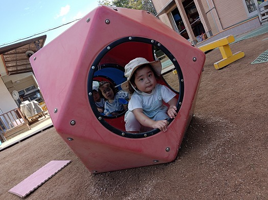 中に入って「お~い」と友だちや職員を呼んだり、足を伸ばして上に登ろうとしたりしていました。