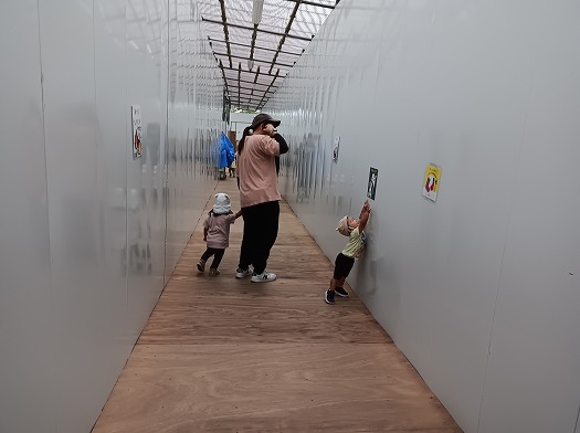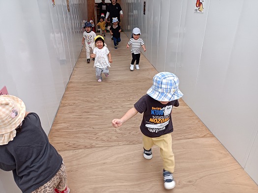 丘っこストリートの扉が開くと嬉しくして一斉に走って行くこどもたち。通路の壁に貼ってある絵本の表紙を一つひとつ見ながら出口へ行っていました。