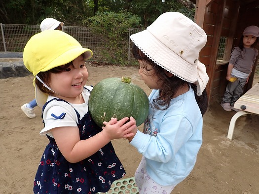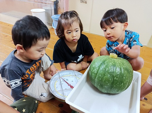2025年10月24日 かぼちゃの収穫 2歳児 にじ かぼちゃんの収穫をしました。 かぼちゃを収穫することを伝えると、「かぼちゃ~」と言いながら畑へ行く子もいました。 収穫したかぼちゃを実際に持ってみました。 重たくてコロコロ転がっている瞬間もありましたが、落とさないように必死な表情でした。 どのくらい重たいのか計ってみると… 3㎏でした! クッキングは何をしようかな? 一覧へ戻る
