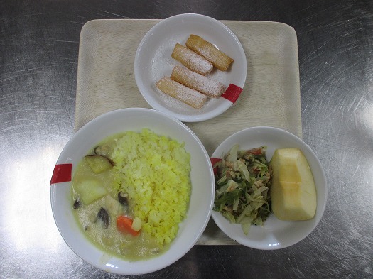 2025年11月04日 ≪10月30日の給食、おやつ≫ 給食室 昼食 ・秋の実りホワイトカレー ・ツナサラダ ・りんご おやつ ・米粉のチュロス ・牛乳 『秋の実りカレー』には、2種類のきのこ、エリンギとしめじ、 さつまいもが入っていました。 しめじをさくお手伝いをにじ組さんがしてくれましたよ。😊 シチューのルーとカレー粉でホワイトカレーにしています。 こどもたちに人気のメニューです。 おやつは『米粉のチュロス』でした。 材料は、米粉、ベーキングパウダー、砂糖、塩、米油、水です。 卵、乳、小麦不使用で、こどもたちに人気でした。 一覧へ戻る