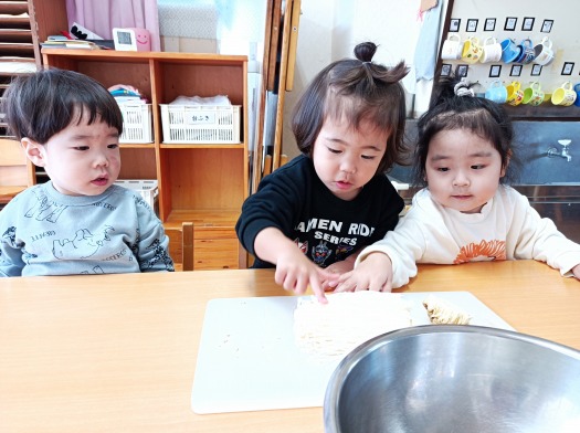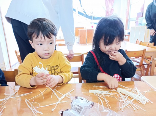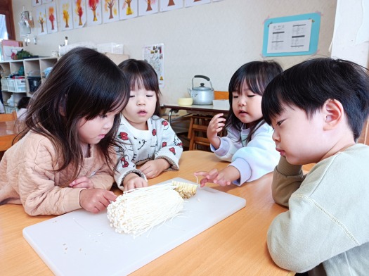 2025年11月12日 えのき割き 2歳児 にじ 最近はしめじ割きの手伝いをすることが多かったにじ組。 今回はえのき割きをしました。 「えのきだよ」と声を掛けながらいつものように割き始めます。 色が白いため「うどんみたい」という声も聞こえてきました。 一覧へ戻る