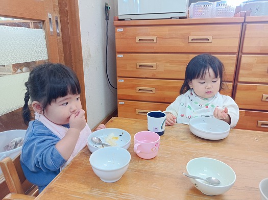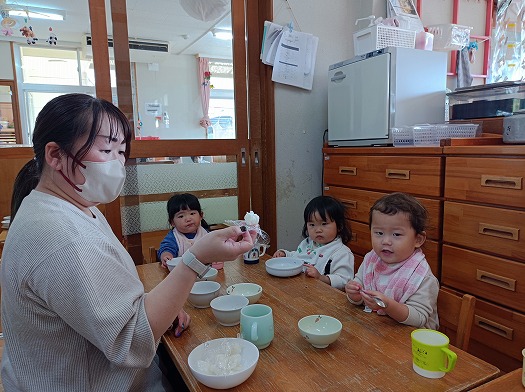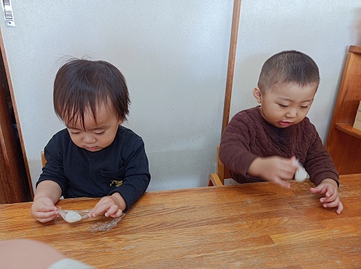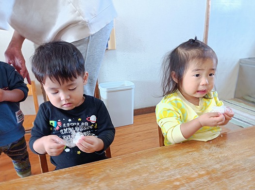 2025年11月12日 やっぱり これだね~♪ 1歳児 ゆき 新米が美味しい時期がやってきました。 給食室から新米のおにぎりをもらい、みんなで美味しいお米を堪能しました。 白いご飯が大好きなこどもたち。 おにぎりを見せると、「ちょーだい!」の声がたくさん溢れました。 おにぎりを包むラップを自分で頑張って外します。 指先を器用に使って、上手にラップを取っていました。 一口サイズのおにぎりはあっという間に口の中に入り、美味しそうに頬張っていました。 これも秋の味覚ですね。 みんな味わえて、美味しさも倍増です! 一覧へ戻る