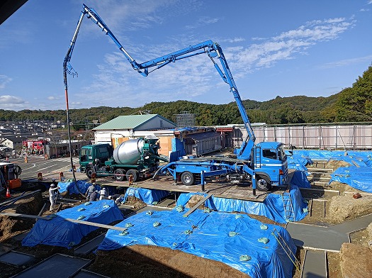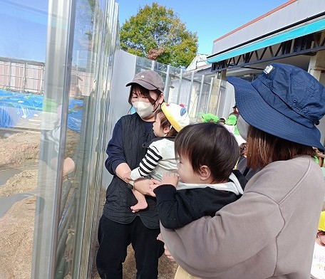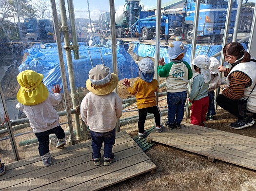 2025年11月18日 コンクリートミキサー車 0歳児 はな 1歳児 ゆき この日は、園庭に掘られていた迷路のような穴に、コンクリートが流し込まれました。 コンクリートミキサー車とポンプ車が繋がり、長いホースを辿って勢いよく出てくるコンクリート。 初めて見る光景にこどもたちは興味津々です。 透明パネルのおかげで、隅々まで見ることができるので、移動して様々な角度から見ていました。 工事中ならではの光景をこれからも楽しみたいと思います。 一覧へ戻る