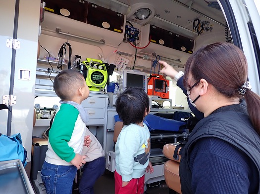 2025年11月12日 はたらくくるま 0歳児 はな 1歳児 ゆき 保育園の駐車場に救急車と消防車がやってきました。 はたらくくるま大好きなゆきぐみさんは大喜びでした。 今回はなんと、車に乗って中も見学させてもらいました。 見たことない機械がたくさんで、興味津々なこどもたち。 実際に触らせてもらえて、とても嬉しそうでした。 大きな車に迫力を感じて乗るのを躊躇っている子も、外から思う存分見学することができました。 一覧へ戻る