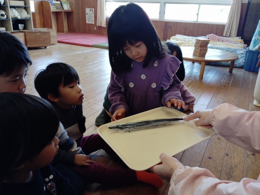 2025年11月25日 秋の魚と言えば… 4歳児 ほし さんまキャラバンをしました。 お部屋でさんまについての話を聞いてから戸外に出ました。 七輪で焼くサンマはとってもいい匂い… みんな何度も手を出して「おかわり!」と食べていました。 こんなにきれいに食べれました☆ 給食で出たさんまもしっかり食べていたこどもたちです。 旬に触れられる素敵なキャラバンでした☆ 一覧へ戻る