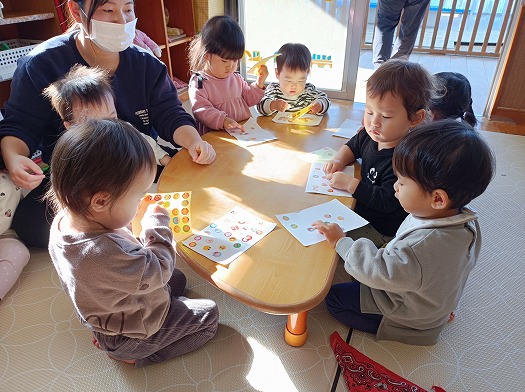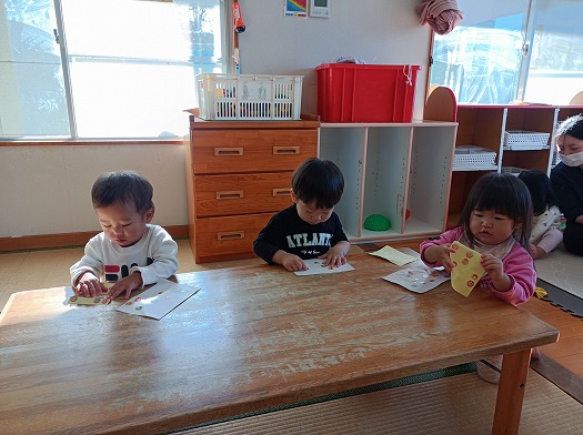 2025年11月22日 シールぺたぺた 0歳児 はな 1歳児 ゆき 保育者が手伝いながらしていたシール貼りが、今では保育者が手伝わなくても一人で台紙から剥がして貼ることができるようになりました。 そうなると、一気に楽しくなるシール貼り。 紙とシールを手渡すと、集中して貼っています。 時折、お友だちのシールを覗き込み、自分の紙を見比べたり、シールを友だちの台紙に貼ってあげたりと友だちと一緒に楽しみながら、紙一杯に貼っていました。 そんな姿に成長を感じ、嬉しくなる保育者です。 一覧へ戻る