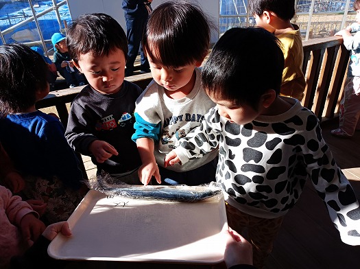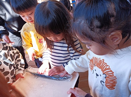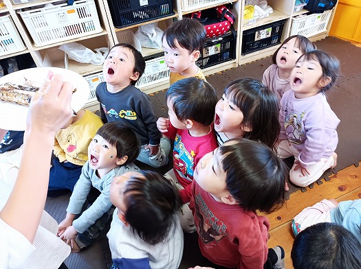 2025年11月22日 大きく口を開けて 2歳児 にじ さんまキャラバンがありました。 ラップに包んであるさんまをつんつんと触ってみました。 焼きたてのさんまが来て「食べた~い」とこどもたち。 大きな口を開けて順番を持っていました。 まるでにじ組さんが魚のようです! 焼きたての秋刀魚を美味しそうに食べていました。 一覧へ戻る