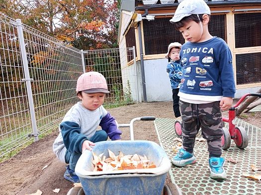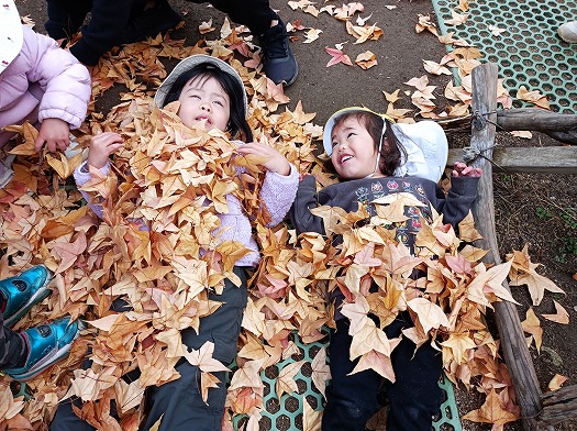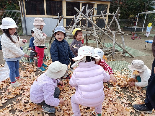 2025年12月05日 たくさんの落ち葉 2歳児 にじ 落ち葉で遊びました。 袋からたくさんの落ち葉が落ちてくると「きゃ~」と大喜び。 落ち葉を上に投げて舞っていく様子を楽しんだり、お布団のようにしたりいろいろなあそび方で楽しみました。 落ち葉の中にはどんぐりも隠れていて探すことに必死になっている子もいました。 どんぐりを見つけた時の「あった~」という表情が微笑ましかったです! 最後は葉っぱを集めてカメが入っている容器まで運びました。 一覧へ戻る