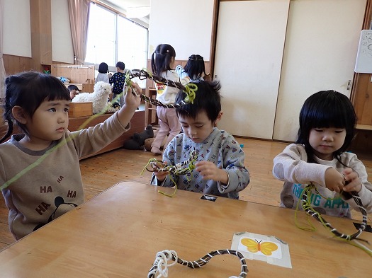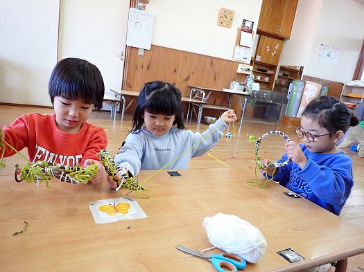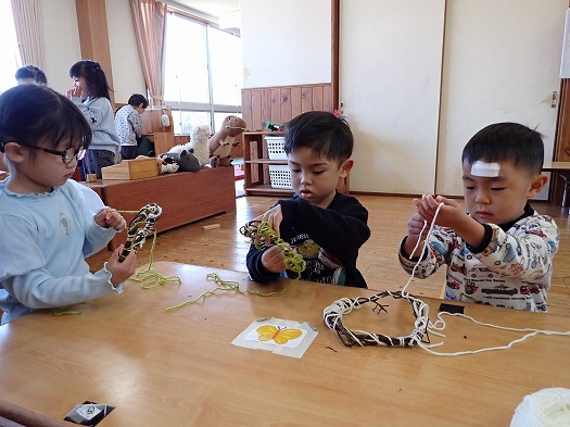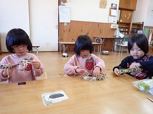 2025年12月23日 クリスマスリース 3歳児 つき もうすぐクリスマス☆ ということでクリスマスリースを作りました。 土台は以前収穫した芋のツルです。毛糸を巻いていきます。 みんな真剣にもくもくと毛糸を巻き巻きしていました。 またお渡ししたら、お家の玄関などに飾ってみてくださいね☆ 一覧へ戻る