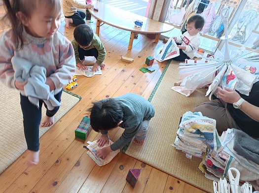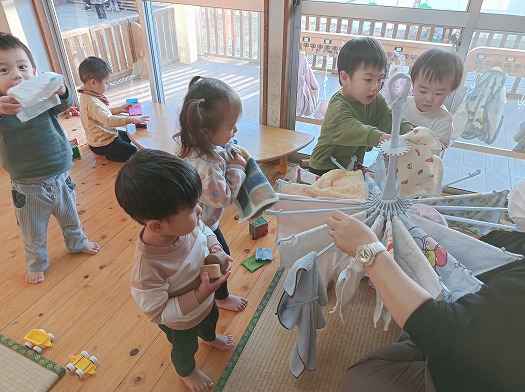2025年12月11日 てつだい 0歳児 はな 1歳児 ゆき 保育者が洗濯物を片付けているのを傍でじっと見ていました。 すると、「していい」と伝えてきたので一緒に始めました。 ハンドタオルを上手に畳めることもできていて驚きました。 お家でも手伝いをしているのかな。 一覧へ戻る