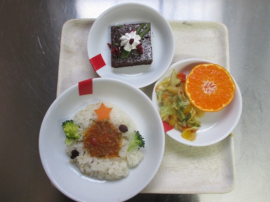 レーズン入りのごはんをリースに見立てて、人参を星型にくり抜いて、ブロッコリーを飾りました。ごはんとレーズン‼?と思うかもしれませんが、これが意外と合うんです。ドライカラーのピリ辛さとレーズンの甘みが良い組み合わせです。