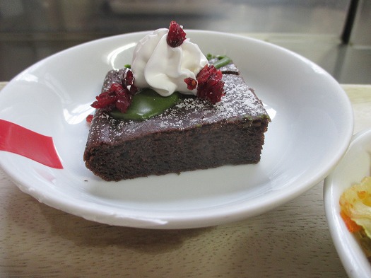 米粉と豆腐のブラウニーに抹茶のアイシングを掛け、豆乳ホイップをのせ、ドライクランベリーを散らしています。優しい甘さでおいしいです。よく食べていました。