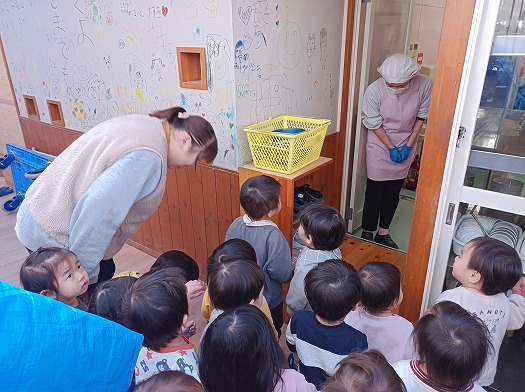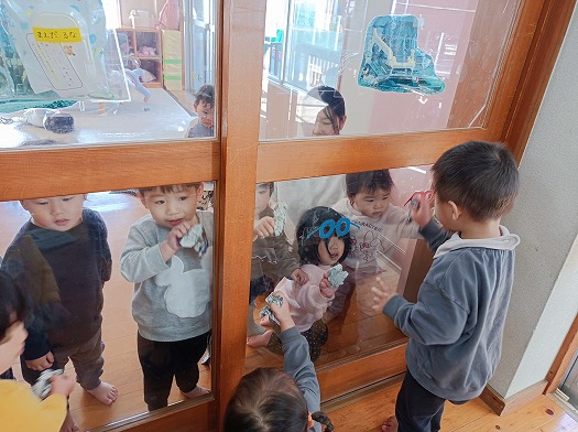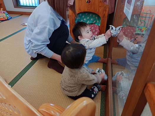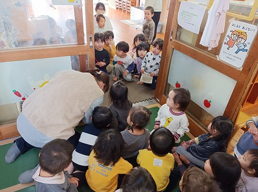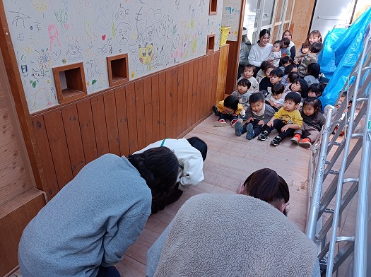 保育者が「今年は大変お世話になりました」「良いお年をお過ごし下さい」と言っているのを始めは不思議そうに見ていたこどもたちでしたが、各クラスを回るうちに一緒にお辞儀をする姿も見られました。